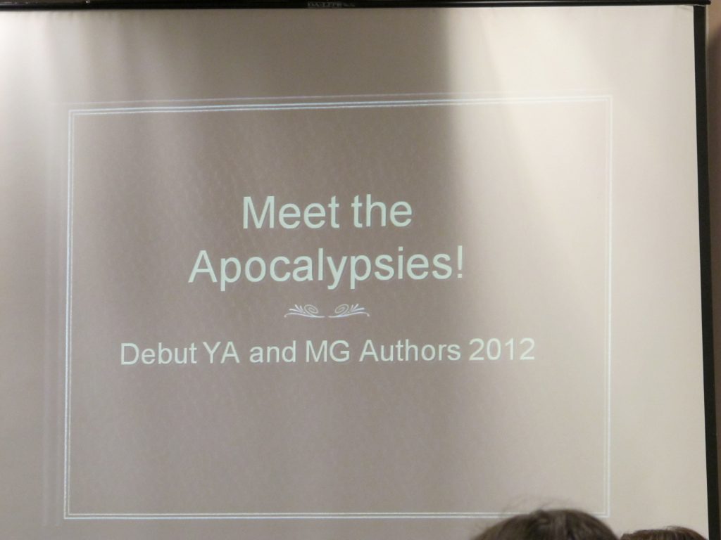 The Editors for the YA Editors Buzz Panel. Everything sounded fantastic. You can read all about it at Publisher’s Weekly-BEA 2012: Diversity Rules at YA Editor’s Buzz Panel. But I want to give a special shout out to my fellow Apocalypsies: Gennifer Albin, author of Crewel and Kat Zhang, author of What’s Left of Me!!!!