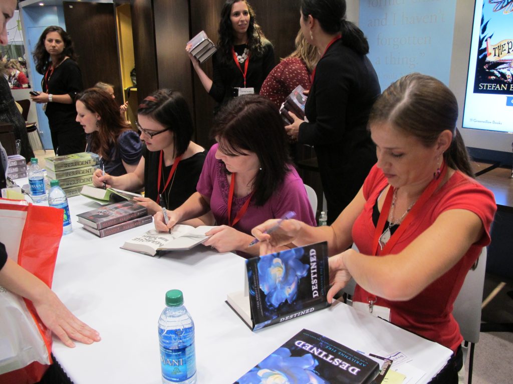 Apocalypsie Elizabeth Norris signing UNRAVELING, Veronica Roth signing INSURGENT, Bethany Griffin signing MASQUE OF THE RED DEATH and Aprilynne Pike signing DESTINED.