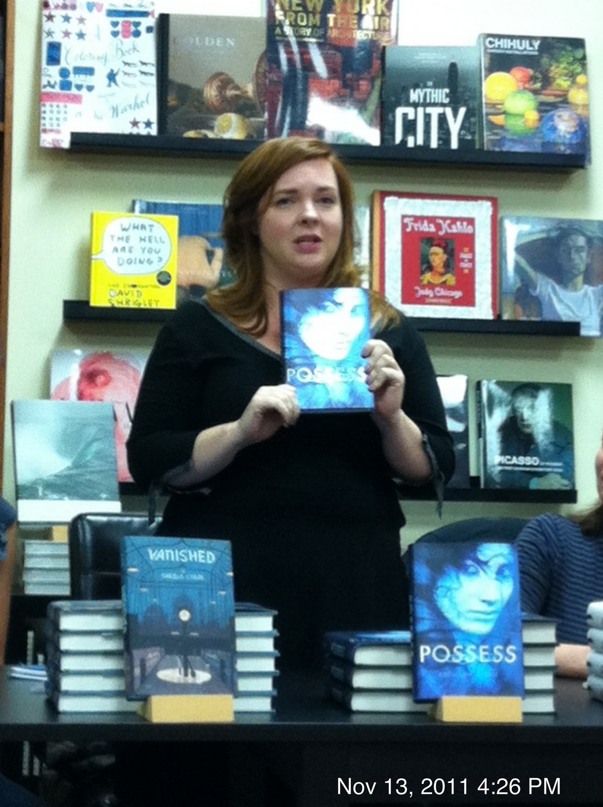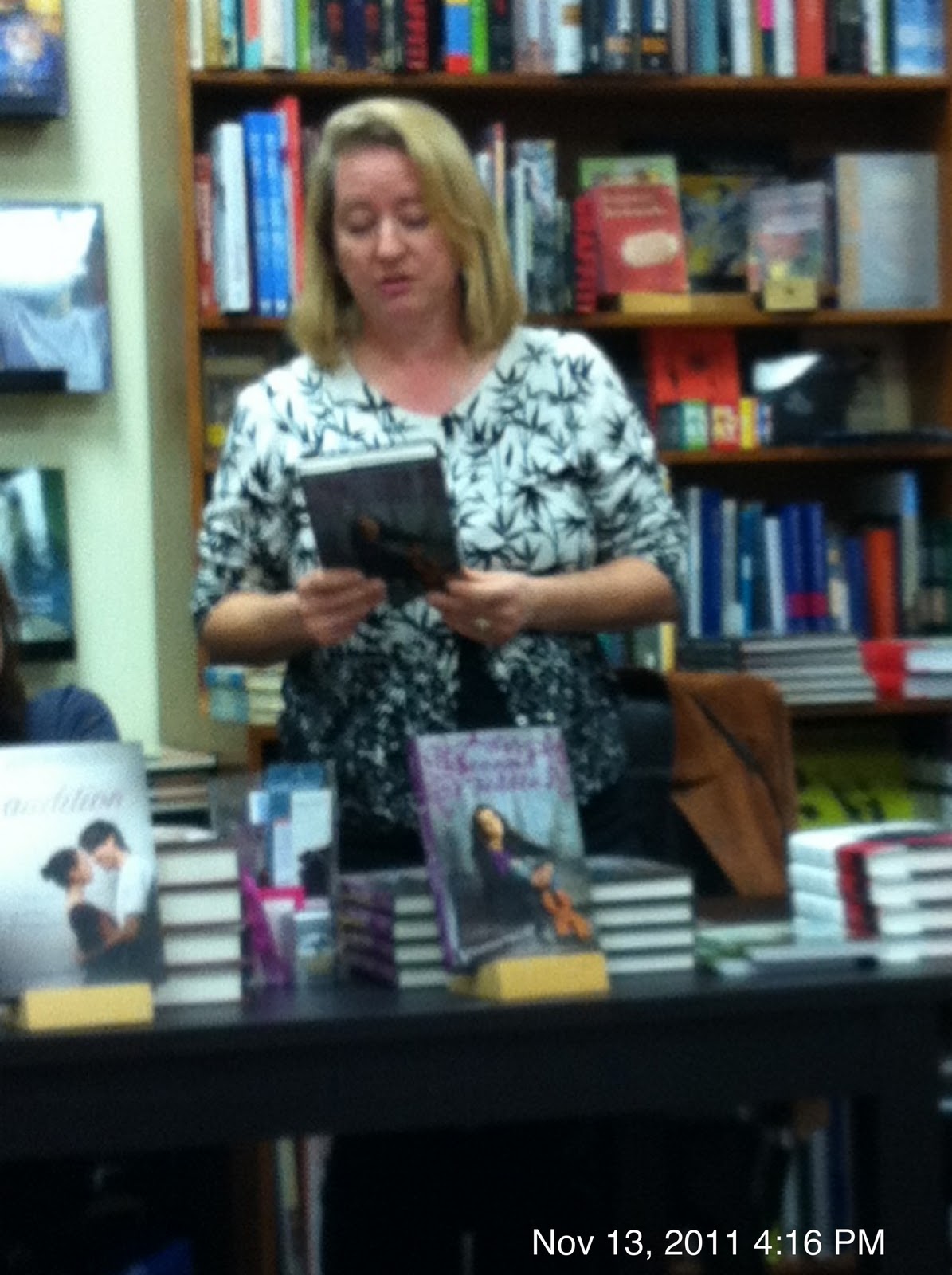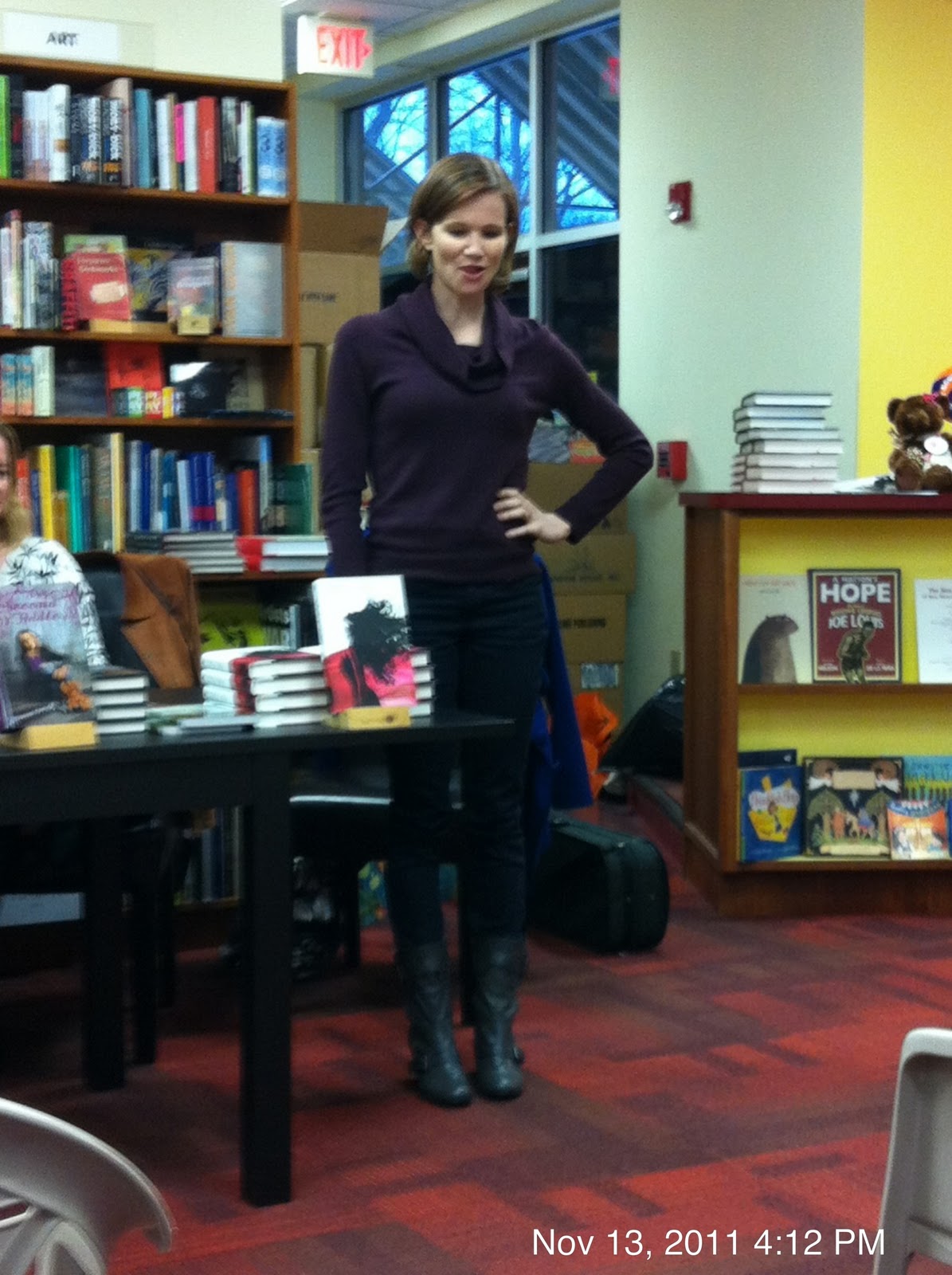 I’m apologizing in advance for the poor picture quality. I stink a big one because I forgot my good camera for this book signing event. I can legitimately blame it on the 6 year old who was needed help with his iPod so he could listen to a novel on the way to the book signing…yeah, I didn’t yell at him either. :o)