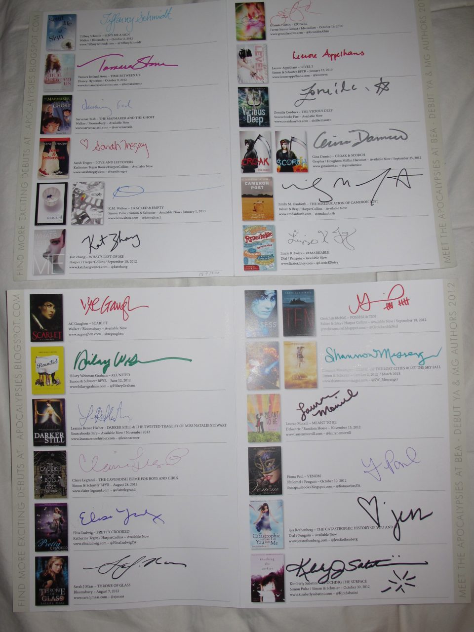 The Editors for the YA Editors Buzz Panel. Everything sounded fantastic. You can read all about it at Publisher’s Weekly-BEA 2012: Diversity Rules at YA Editor’s Buzz Panel. But I want to give a special shout out to my fellow Apocalypsies: Gennifer Albin, author of Crewel and Kat Zhang, author of What’s Left of Me!!!!