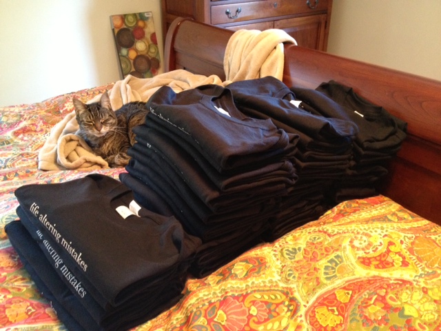 And the T-shirts are here too!!!! They are sitting on the bed with my writing buddy, Beans. I already have a winner from the last T-shirt contest. But I’ve got an idea brewing for next week…*waggles eyebrows*